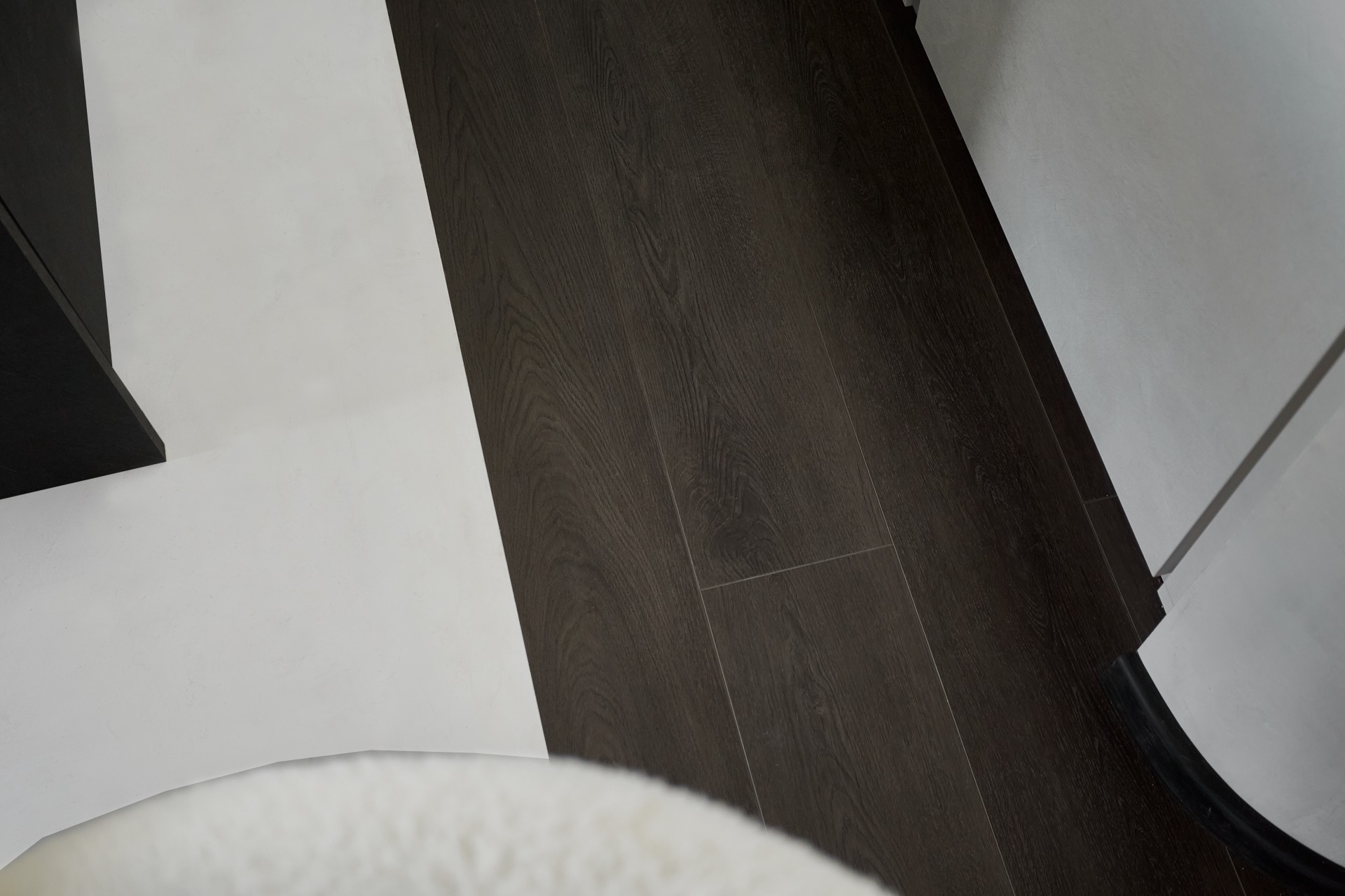 За тёмную сторону отвечал кварцевый ламинат, а для контрастных светлых пятен использовали микроцемент.