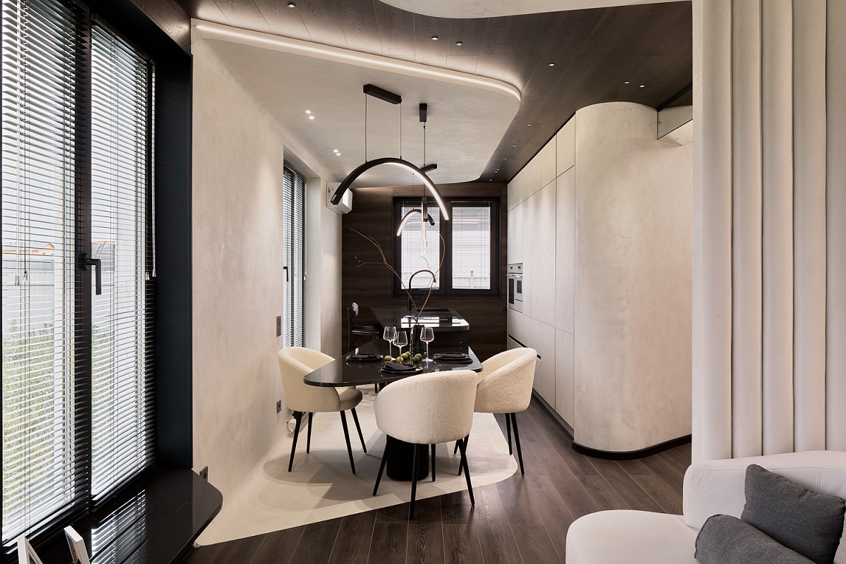 Это и стало точкой отсчёта для создания интерьера героев. Дизайн-студия BALKA.Studio воссоздали на кухне героев выпуска атмосферу бизнес-класса самолета — получился эргономичный интерьер с обтекаемыми формами, высоким уровнем сервиса в зоне готовки и пространством для мягкой посадки в зоне отдыха.