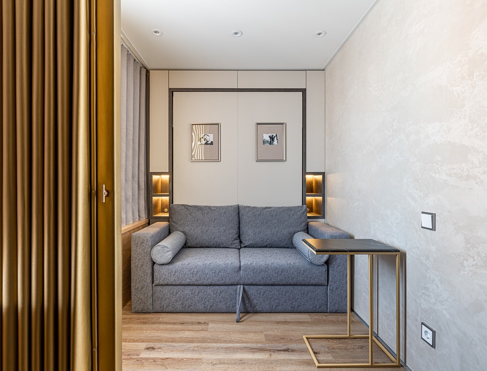 Такой ход сыграл на то, чтобы зона отдыха стала более тёплой и живой. За это здесь отвечает золотая перегородка и фурнитура, тёплая подсветка и кварцевый ламинат Дуб Калифорния на полу.