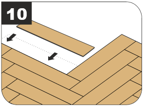 7.7.2 Демонтируйте лишние части плашек с первых треугольников. Используйте их для монтажа открытых частей пола вдоль стены. Укладывайте плашки у стены с учетом зазора для расширения 8 мм.