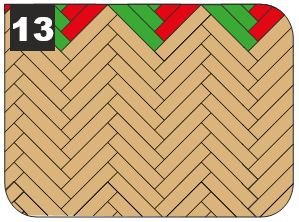 7.7.2 Демонтируйте лишние части плашек с первых треугольников. Используйте их для монтажа открытых частей пола вдоль стены. Укладывайте плашки у стены с учетом зазора для расширения 8 мм.