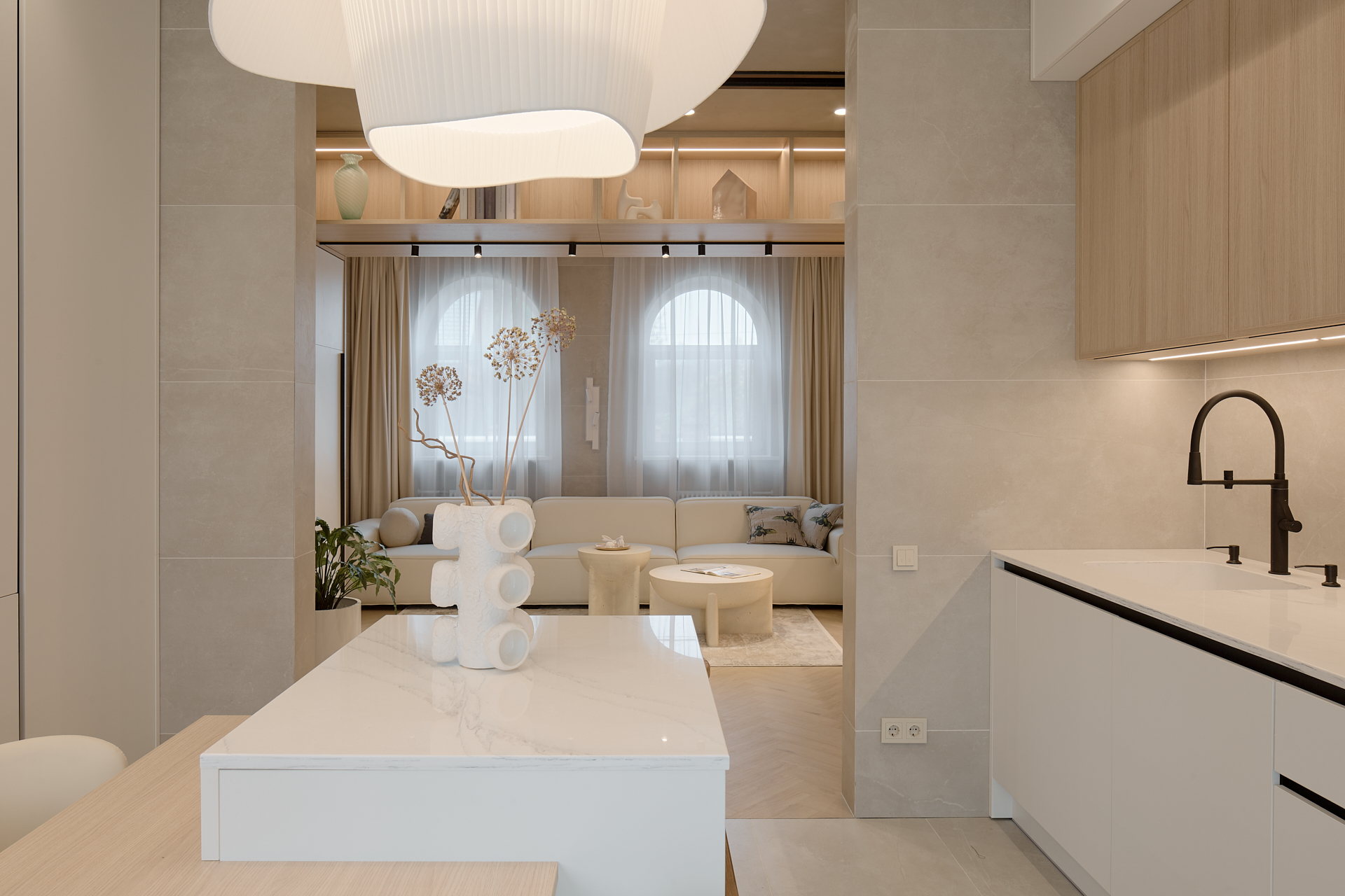 Новая кухня-гостиная стала большой песочницей – интерактивной, безопасной и антивандальной, учитывая особенные потребности самого младшего члена семьи. Стол научился левитировать, телевизор – мигрировать, а антресоль – зонировать.